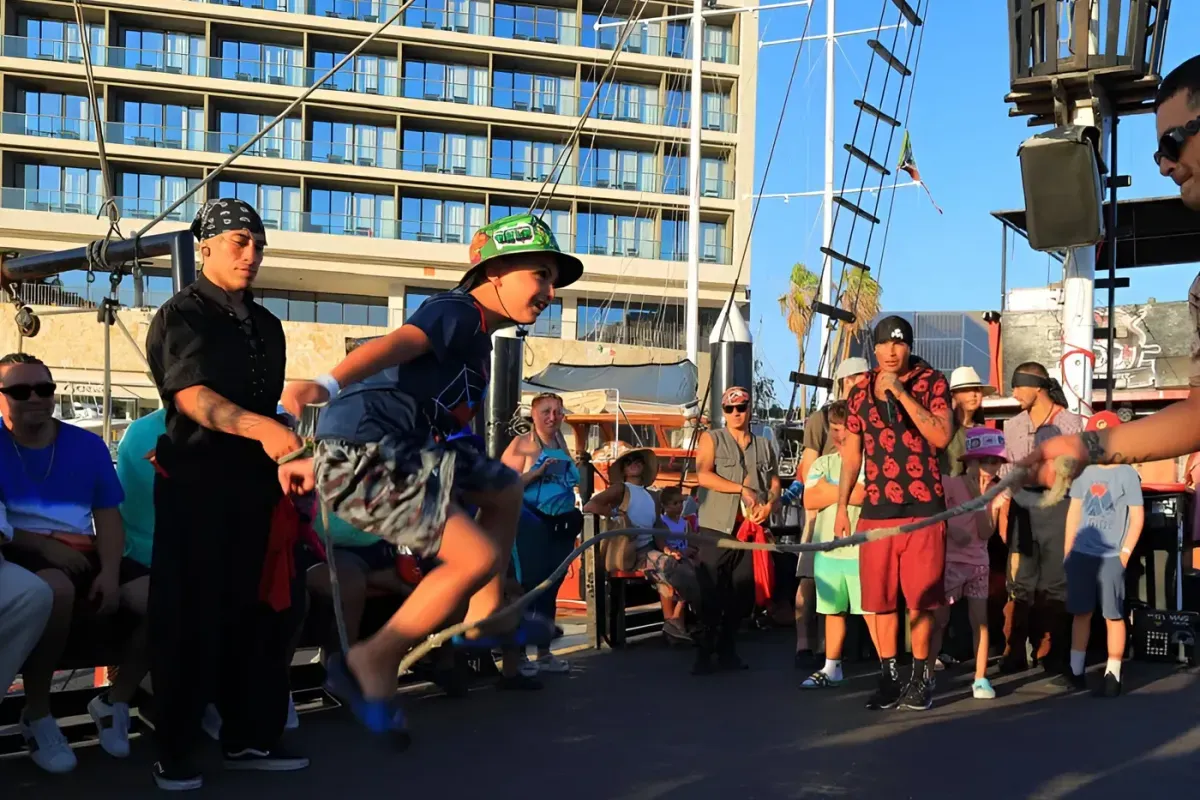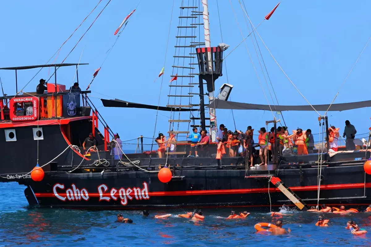 Discover the best way to enjoy a day: on the water. Cabo has been home to pirates since the 1500s. We cruise back in time aboard our 100-foot wooden early 1900s pirate sailboat showing you the world-famous arch while telling tall tales about Cabo's history and the pirates that sailed its seas. Strike our real working sails and drop anchor to get quality time with the tropical fish. After you walk the plank to snorkel, enjoy a lunch of beef and chicken burritos, chips, salsa, and guacamole, not to mention the open bar. Grog (pirate rum punch), mai tai, margaritas, and lots of juices for the kids. We mix some Baja stories and a lot of fun. Ideal space for those looking to get loose, relax, and act like a real pirate for a day. Enjoy great music, fun, and hands-on activities with the crew until we return to the dock!