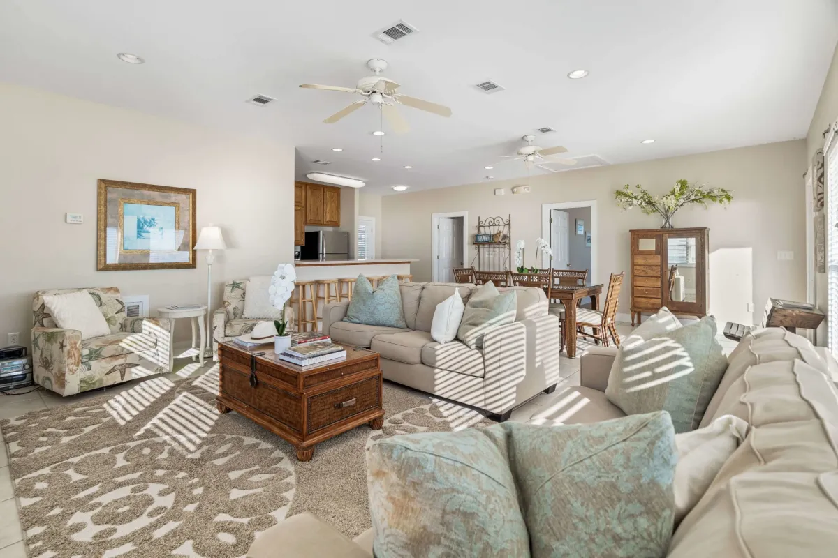 - Open-Concept Living — Bright living and dining spaces with coastal décor
