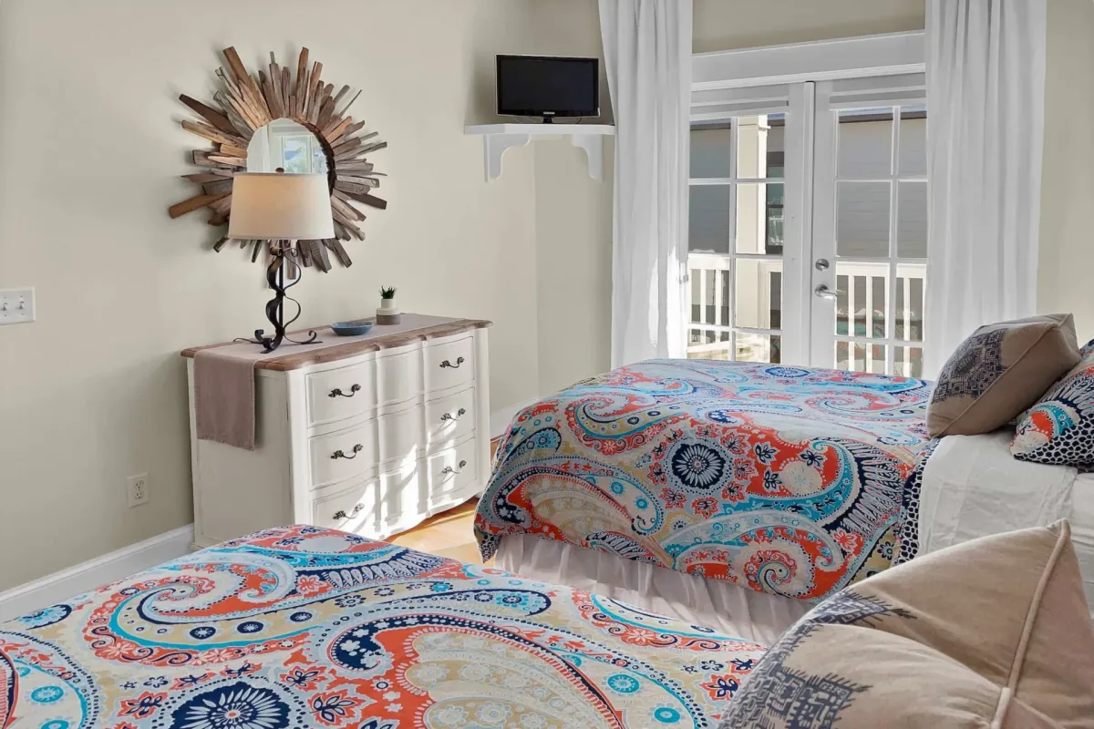 - 2nd Floor Twin Guest Room : 2 twin beds, TV, ceiling fan, private entrance to balcony, closet and dresser storage, adjacent to full bath
