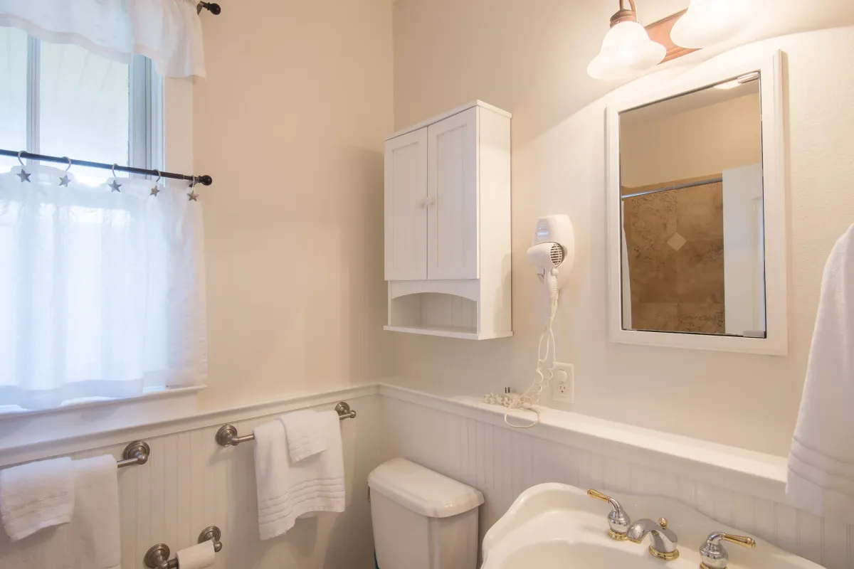 - 2nd Floor King Suite: TV, ceiling fan, private entrance to balcony, closet and dresser storage, en suite bath with walk-in shower