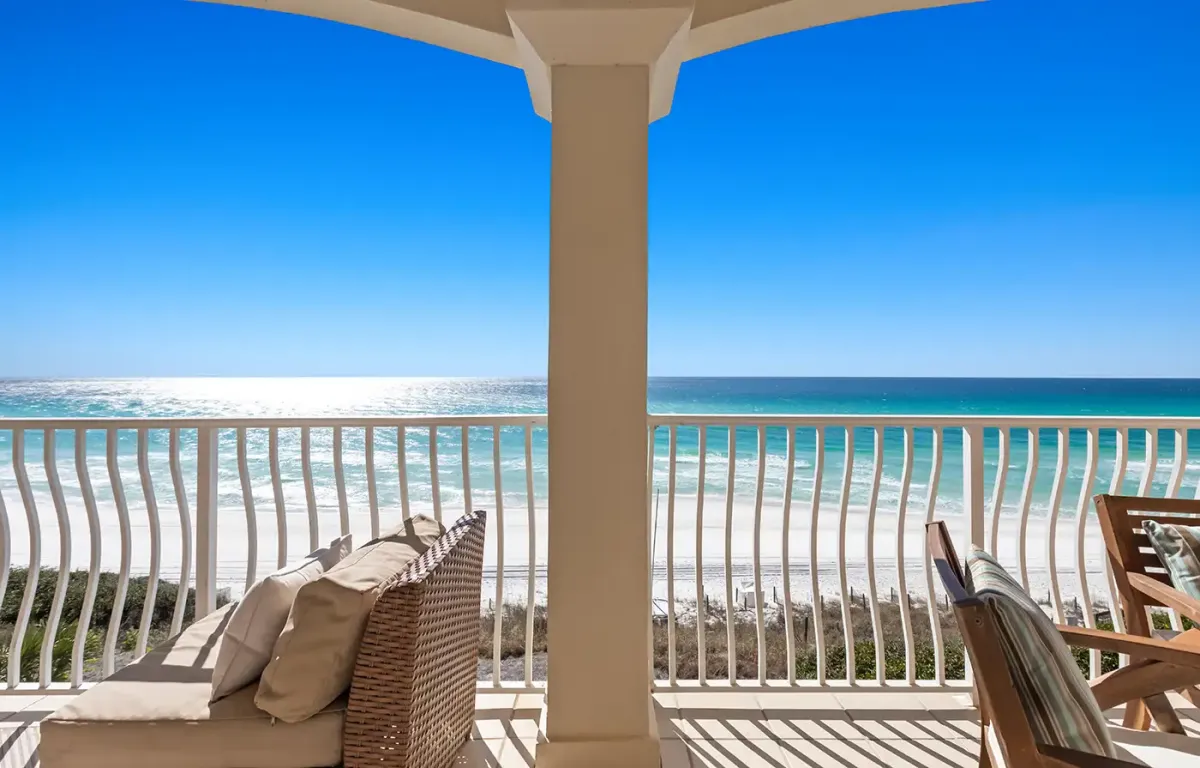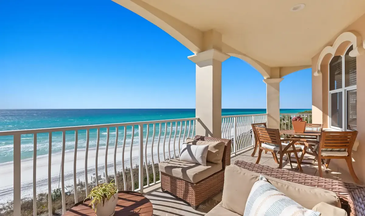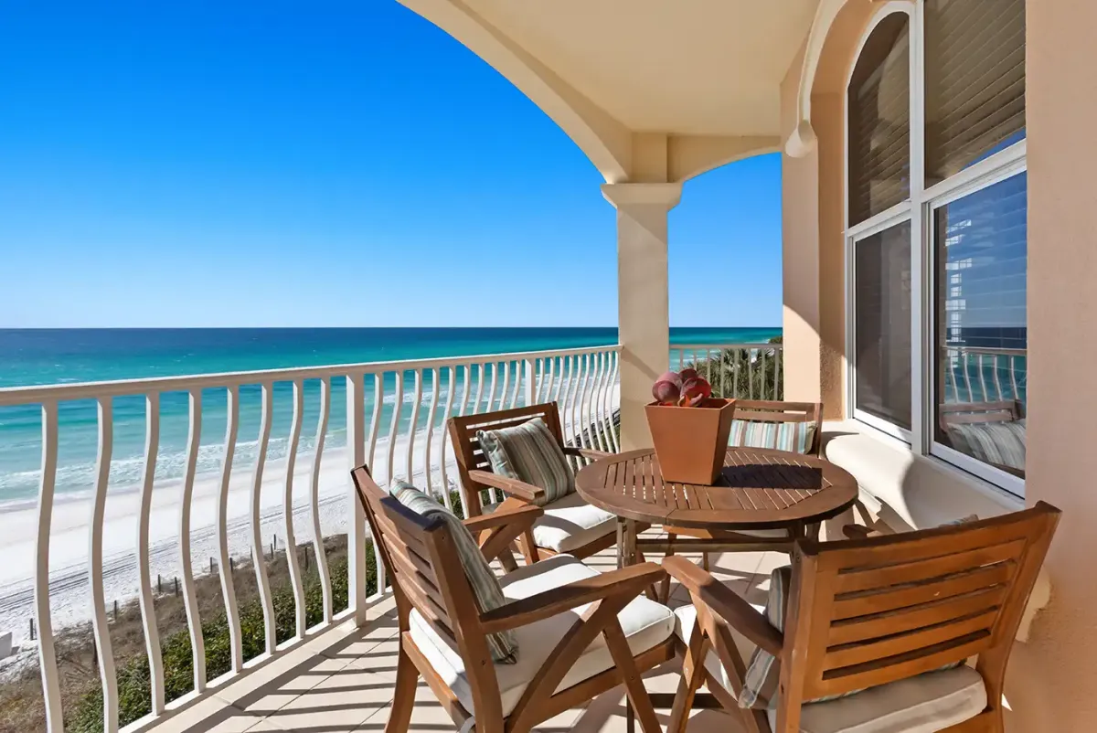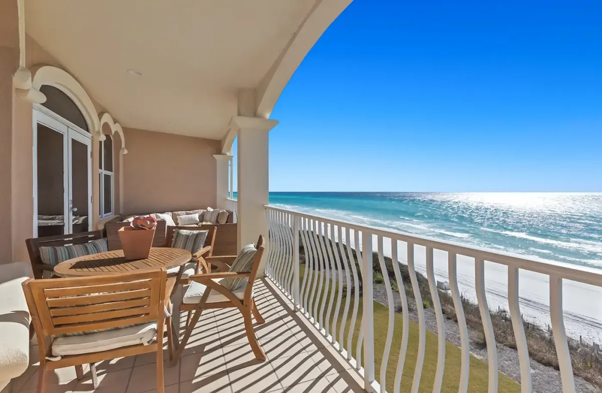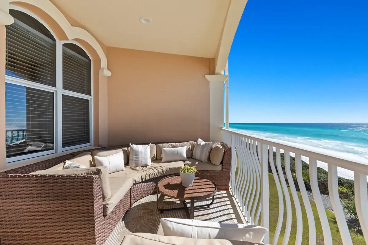 - Gulf facing balcony with cushioned seating and outdoor dining