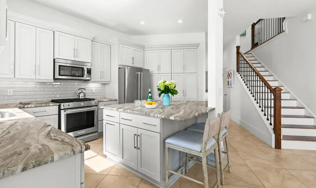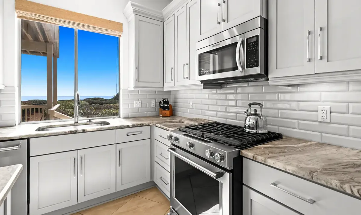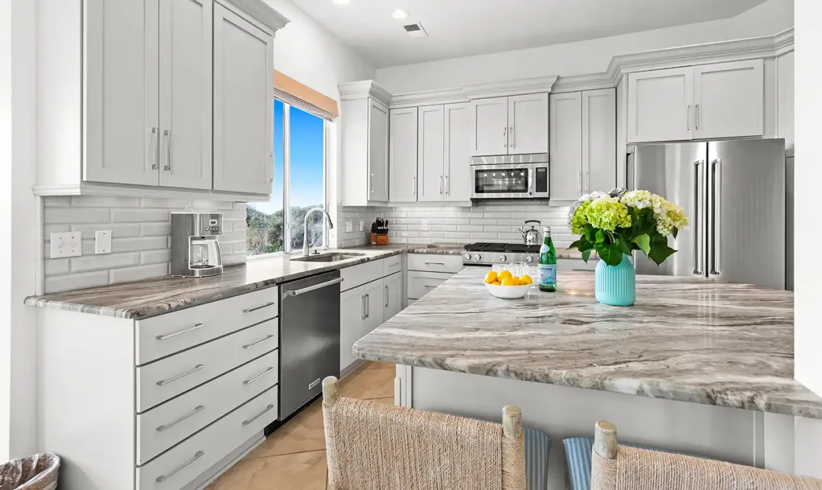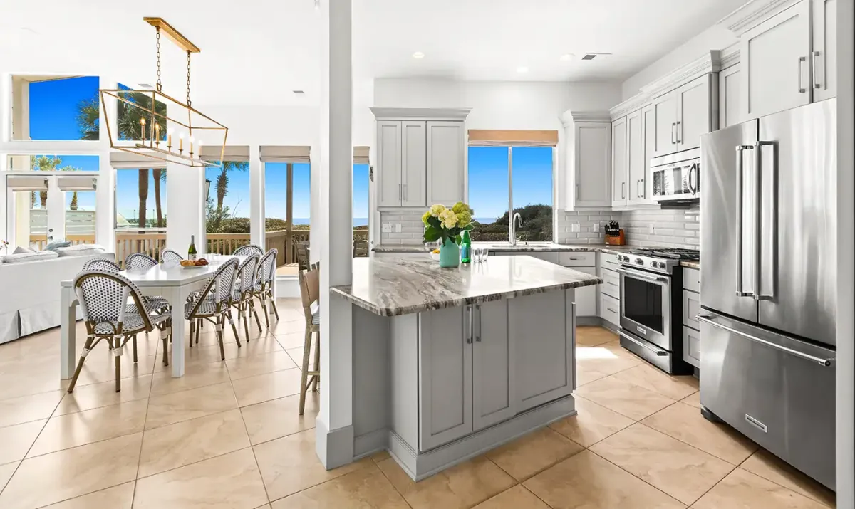 The spacious first-floor living area is designed for gathering and unwinding, featuring a Smart TV, fireplace, and uninterrupted views of the Gulf. The gourmet kitchen is equally impressive, offering modern appliances, generous prep space, and a well-stocked setup for everything from casual breakfasts to full family dinners. Enjoy meals together at the dining table with seating for eight, plus additional seating at the breakfast bar, or take the experience outside to the Gulf-facing patio and balcony for unforgettable sunsets and coastal breezes.